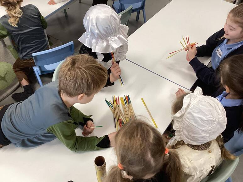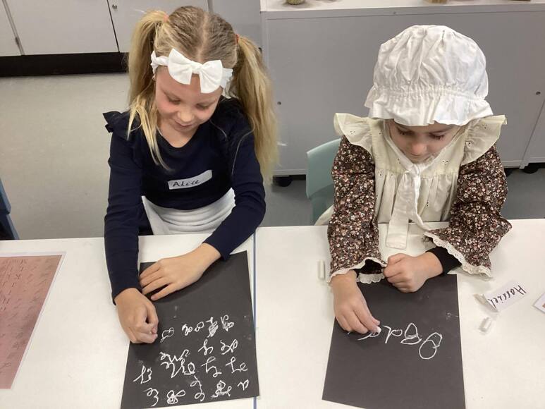 Victorian school day filled with handwriting; chanting; drills on the playground; playing tiddlywinks and jacks; trying on a Dunce hat; still life drawings and a lot of fun!